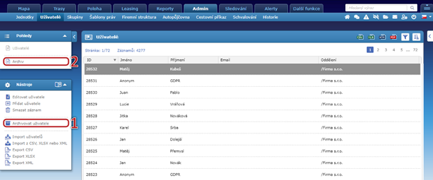 Tuto funkci naleznete v levém nástrojovém panelu v submodulu Uživatelé, jedná se o položku Archivovat uživatele (1).