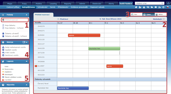 Přehled rezervací je grafickou podobou standardního pohledu na žádanky uživatelů. Je zde zobrazen Ganttův diagram (2) s rozplánováním vytíženosti jednotlivých vozidel a žádankami uživatelů.