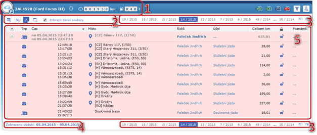 Hlavní část obrazovky zaujímá řádkový výpis tras (5), kde jsou podrobně uvedeny jednotlivé trasy, které jednotka vykonala. Výpis obsahuje několik sloupců, které popisuje následující tabulka: