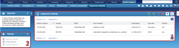 V tomto submodulu lze evidovat dopravní nehody k jednotlivým vozidlům a řidičům. Stránka je tvořena výpisem (1) dopravních nehod a levým postranním panelem (2) s nástroji. Výpis, jak bývá zvykem, obsahuje možnost exportu zobrazených záznamů, nastavení sloupců výpisu a filtrování.